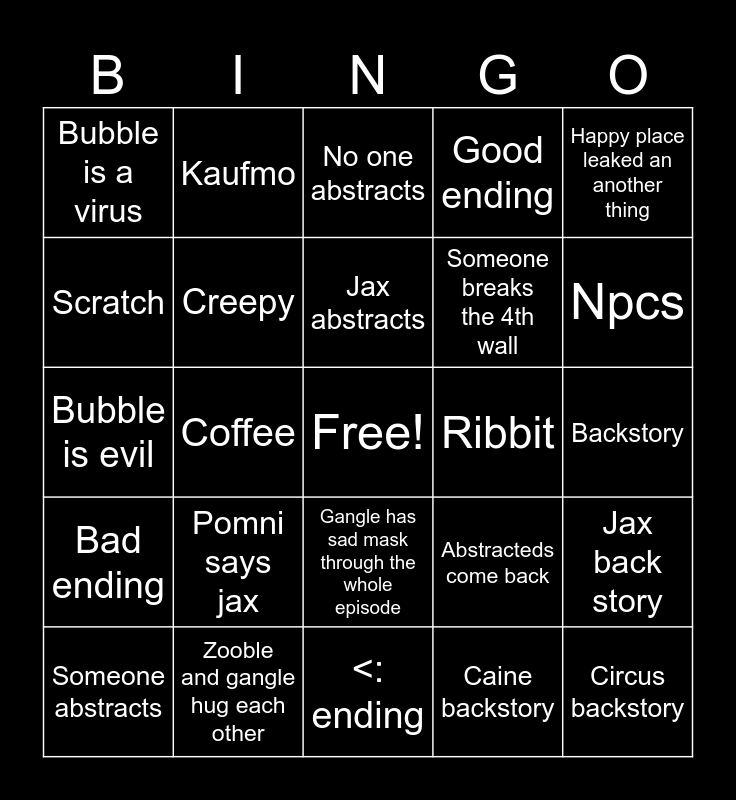 This bingo card has a free space and 24 words: Pomni says jax, Zooble and gangle hug each other, Jax abstracts, Someone abstracts, Happy place leaked an another thing, Bubble is a virus, Scratch, Kaufmo, Ribbit, Gangle has sad mask through the whole episode, Someone breaks the 4th wall, Bubble is evil, Abstracteds come back, Jax back story, Creepy, Caine backstory, Backstory, No one abstracts, Npcs, Coffee, Circus backstory, Bad ending, Good ending and <: ending.
