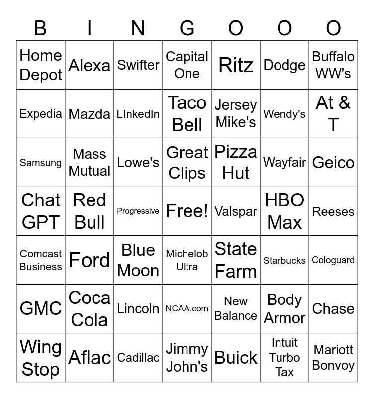 This bingo card has a free space and 48 words: New Balance, Wendy's, Jimmy John's, Red Bull, Lowe's, Reeses, Alexa, Aflac, Dodge, Michelob Ultra, Buffalo WW's, Capital One, Wayfair, Pizza Hut, GMC, HBO Max, Expedia, At & T, Body Armor, Ritz, Jersey Mike's, Progressive, Home Depot, Mazda, Chase, LInkedIn, Geico, Wing Stop, Great Clips, Mass Mutual, Intuit Turbo Tax, Valspar, Cologuard, Coca Cola, Chat GPT, State Farm, Starbucks, Samsung, Blue Moon, Lincoln, Comcast Business, Mariott Bonvoy, Swifter, Cadillac, Taco Bell, NCAA.com, Ford and Buick.