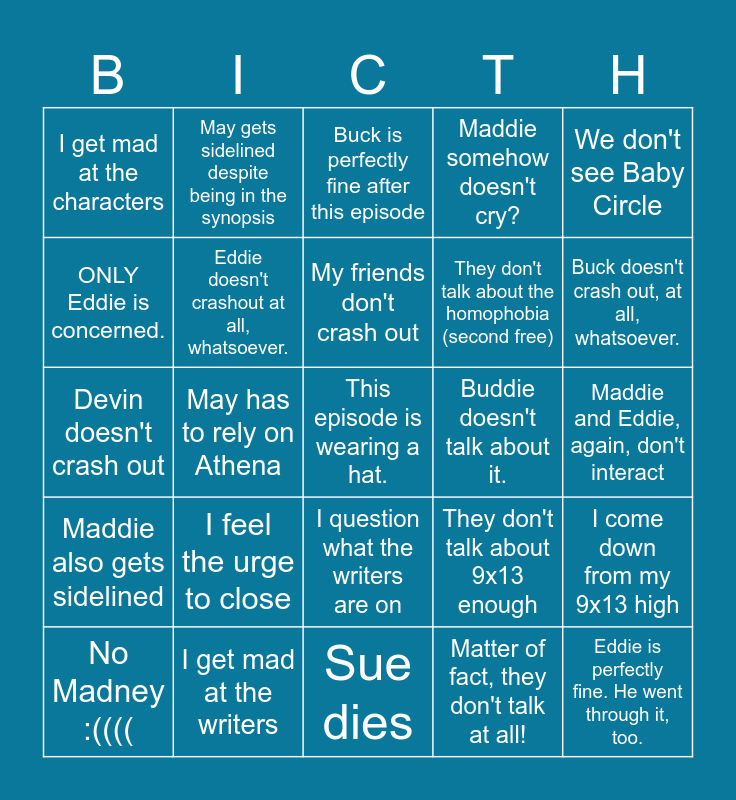 This bingo card has a free space and 24 words: I feel the urge to close, I get mad at the writers, My friends don't crash out, No Madney :((((, We don't see Baby Circle, I get mad at the characters, ONLY Eddie is concerned., May gets sidelined despite being in the synopsis, Buddie doesn't talk about it., I question what the writers are on, They don't talk about the homophobia (second free), Devin doesn't crash out, They don't talk about 9x13 enough, I come down from my 9x13 high, Eddie doesn't crashout at all, whatsoever., Matter of fact, they don't talk at all!, Maddie and Eddie, again, don't interact, Buck is perfectly fine after this episode, Buck doesn't crash out, at all, whatsoever., May has to rely on Athena, Eddie is perfectly fine. He went through it, too., Maddie also gets sidelined, Maddie somehow doesn't cry? and Sue dies.