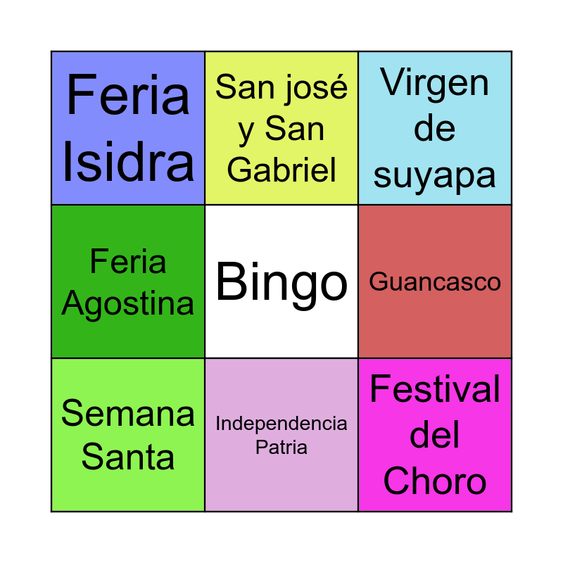 This bingo card has a free space and 8 words: Guancasco, Virgen de suyapa, San josé y San Gabriel, Semana Santa, Feria Isidra, Festival del Choro, Feria Agostina and Independencia Patria.