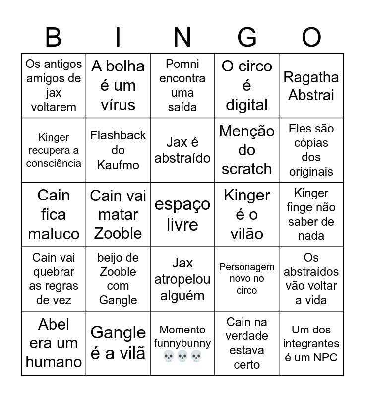 This bingo card has a free space and 24 words: beijo de Zooble com Gangle, Gangle é a vilã, Jax é abstraído, Abel era um humano, Ragatha Abstrai, Os antigos amigos de jax voltarem, Kinger recupera a consciência, A bolha é um vírus, Kinger é o vilão, Jax atropelou alguém, Menção do scratch, Cain fica maluco, Personagem novo no circo, Os abstraídos vão voltar a vida, Flashback do Kaufmo, Cain na verdade estava certo, Kinger finge não saber de nada, Pomni encontra uma saída, Eles são cópias dos originais, Cain vai matar Zooble, Um dos integrantes é um NPC, Cain vai quebrar as regras de vez, O circo é digital and Momento funnybunny 💀💀💀.
