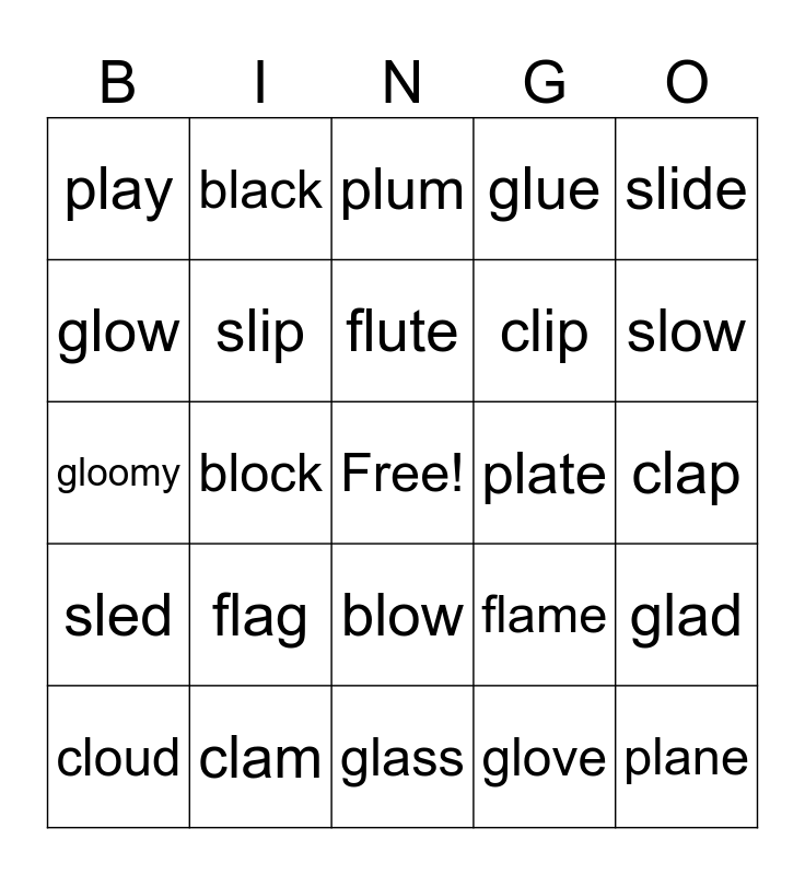This bingo card has a free space and 24 words: flag, clam, flute, cloud, slide, play, glow, black, plate, blow, clip, gloomy, flame, glad, slip, glove, clap, plum, slow, block, plane, sled, glue and glass.