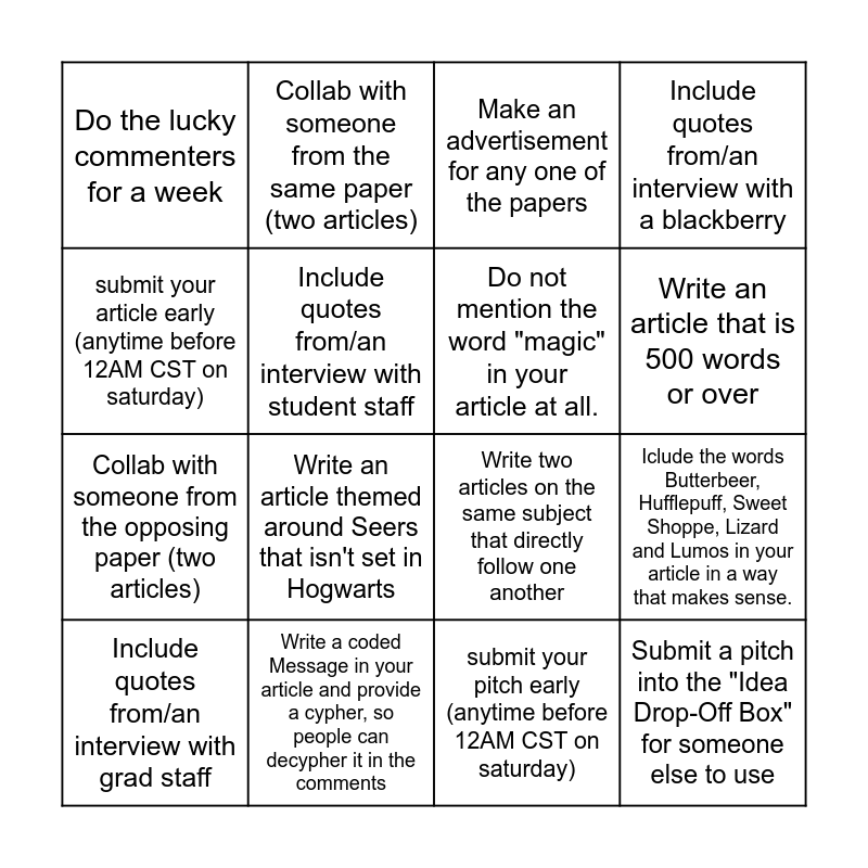 This bingo card has 16 words: Write a coded Message in your article and provide a cypher, so people can decypher it in the comments, Iclude the words Butterbeer, Hufflepuff, Sweet Shoppe, Lizard and Lumos in your article in a way that makes sense., Make an advertisement for any one of the papers, Do the lucky commenters for a week, Collab with someone from the opposing paper (two articles), Collab with someone from the same paper (two articles), Write two articles on the same subject that directly follow one another, submit your pitch early (anytime before 12AM CST on saturday), submit your article early (anytime before 12AM CST on saturday), Include quotes from/an interview with student staff, Include quotes from/an interview with grad staff, Include quotes from/an interview with a blackberry, Write an article themed around Seers that isn't set in Hogwarts, Write an article that is 500 words or over, Do not mention the word "magic" in your article at all. and Submit a pitch into the "Idea Drop-Off Box" for someone else to use.