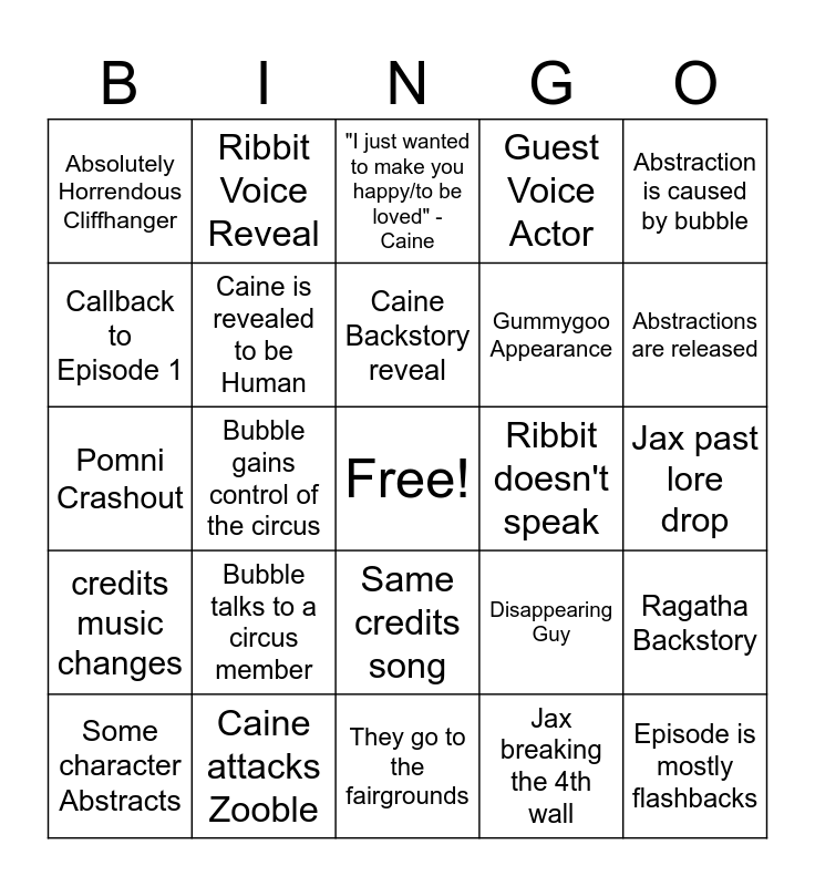 This bingo card has a free space and 29 words: Some character Abstracts, huge lore drop from Kinger, Bubble gains control of the circus, Kaufmo Voice Reveal, Absolutely Horrendous Cliffhanger, "I just wanted to make you happy/to be loved" - Caine, Caine is revealed to be Human, Bubble talks to a circus member, Ribbit doesn't speak, Caine attacks Zooble, Jax past lore drop, Episode is mostly flashbacks, They go to the fairgrounds, Jax breaking the 4th wall, Abstractions are released, Someone enters the cellar, Same credits song, credits music changes, Abstraction is caused by bubble, Pomni Crashout, Disappearing Guy, Caine sends them on old adventures, Gummygoo Appearance, Callback to Episode 1, Guest Voice Actor, Ribbit Voice Reveal, Ragatha Backstory, Caine Backstory reveal and One of the main characters is an NPC.