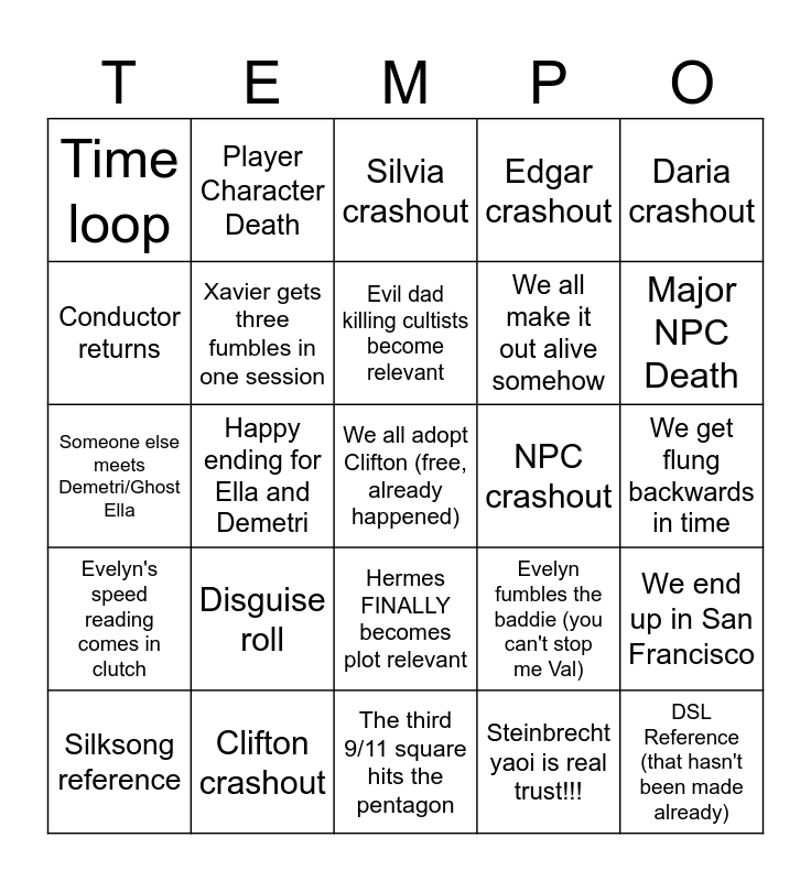 This bingo card has a free space and 44 words: Carrion Reference, DSL Reference (that hasn't been made already), Resident Evil Reference (the residents are evil), Silksong reference, Iron Lung reference, Steinbrecht yaoi is real trust!!!, Silvia crashout, Evelyn crashout, Daria crashout, Clifton crashout, Edgar crashout, NPC crashout, Hermes FINALLY becomes plot relevant, Disguise roll, We crash/damage the car, The third 9/11 square hits the pentagon, Supporting character becomes an enemy/boss, Someone else meets Demetri/Ghost Ella, We fight Thanatos???, Major NPC Death, Player Character Death, Someone gets drunk lol, Useless extreme roll, Time loop, We get flung forwards in time, We get flung backwards in time, Friendly fire, Daria fumbles the baddie, Evelyn fumbles the baddie (you can't stop me Val), Evelyn's speed reading comes in clutch, We end up on Elysium, We end up in San Francisco, Mecha King in Yellow, Someone goes indefinitely insane, Happy ending for Ella and Demetri, Marathon reference, Artorias and Galahad pull up for round 2, Some or all of us become the Carcosian court, Evil dad killing cultists become relevant, Conductor returns, We all make it out alive somehow, TPK, Xavier gets three fumbles in one session and Peyton crashes out over attempts to get 9/11 reference.