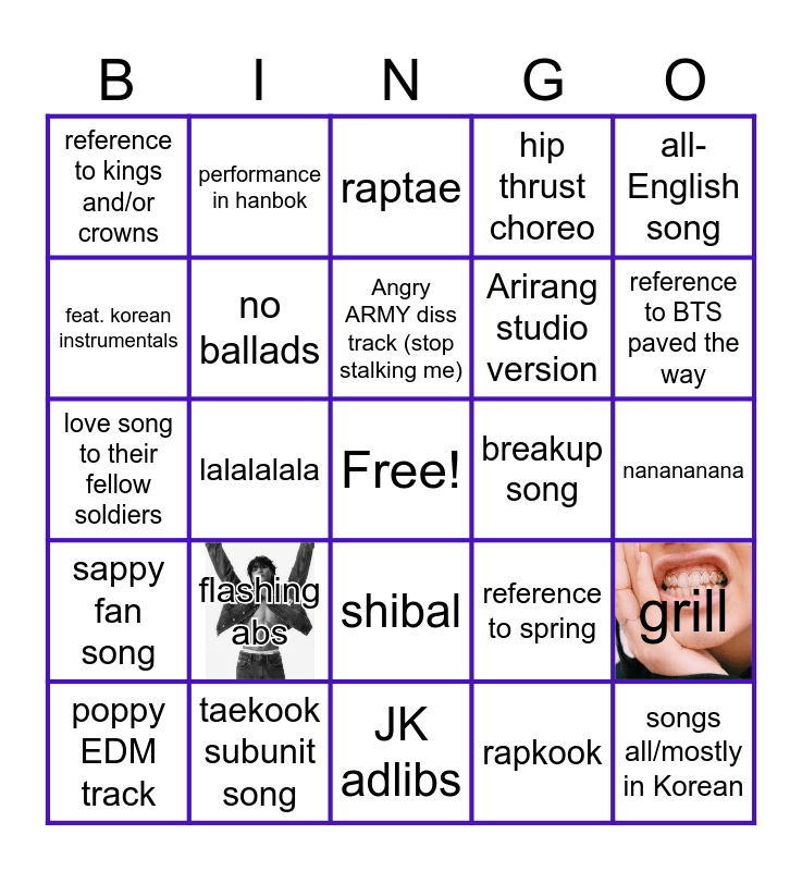 This bingo card has 2 images, a free space and 24 words: flashing abs, taekook subunit song, Angry ARMY diss track (stop stalking me), poppy EDM track, all-English song, reference to kings and/or crowns, feat. korean instrumentals, performance in hanbok, breakup song, shibal, Arirang studio version, love song to their fellow soldiers, reference to spring, grill, no ballads, rapkook, nanananana, raptae, reference to BTS paved the way, lalalalala, songs all/mostly in Korean, sappy fan song, hip thrust choreo and JK adlibs.