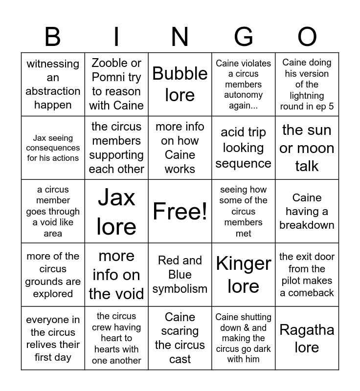 This bingo card has a free space and 24 words: everyone in the circus relives their first day, more info on the void, more info on how Caine works, Caine shutting down & and making the circus go dark with him, Caine doing his version of the lightning round in ep 5, witnessing an abstraction happen, Zooble or Pomni try to reason with Caine, Bubble lore, seeing how some of the circus members met, Caine having a breakdown, a circus member goes through a void like area, the circus members supporting each other, Kinger lore, the exit door from the pilot makes a comeback, Jax seeing consequences for his actions, the circus crew having heart to hearts with one another, Caine scaring the circus cast, Caine violates a circus members autonomy again..., the sun or moon talk, more of the circus grounds are explored, Jax lore, Red and Blue symbolism, acid trip looking sequence and Ragatha lore.