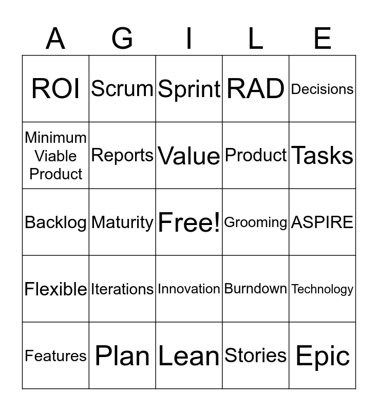 This bingo card has a free space and 24 words: Iterations, Plan, Value, Features, Decisions, ROI, Minimum Viable Product, Scrum, Grooming, Innovation, Product, Backlog, Burndown, Technology, Reports, Stories, ASPIRE, Sprint, Tasks, Maturity, Epic, Flexible, RAD and Lean.
