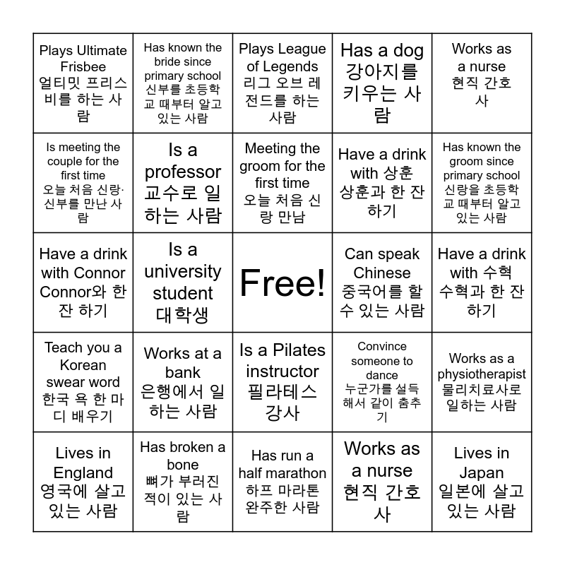 This bingo card has a free space and 29 words: Lives in England 영국에 살고 있는 사람, Is Canadian 캐나다 사람, Is a university student 대학생, Take a selfie with someone you just met 방금 만난 사람과 셀카, Plays Ultimate Frisbee 얼티밋 프리스비를 하는 사람, Plays League of Legends 리그 오브 레전드를 하는 사람, Is a professor 교수로 일하는 사람, Works at a bank 은행에서 일하는 사람, Can speak Chinese 중국어를 할 수 있는 사람, Has broken a bone 뼈가 부러진 적이 있는 사람, Have a drink with 수혁 수혁과 한 잔 하기, Lives in Japan 일본에 살고 있는 사람, Has run a half marathon 하프 마라톤 완주한 사람, Works as a nurse 현직 간호사, Has known the groom since primary school 신랑을 초등학교 때부터 알고 있는 사람, Get a group photo of 5+ people 5명 이상 단체 사진 찍기, Is a Pilates instructor 필라테스 강사, Teach you a Korean swear word 한국 욕 한 마디 배우기, Works as a nurse 현직 간호사, Have a drink with Connor Connor와 한 잔 하기, Convince someone to dance 누군가를 설득해서 같이 춤추기, Take a photo with someone from another country 다른 나라 사람과 사진 찍기, Have a drink with 상훈 상훈과 한 잔 하기, Is meeting the couple for the first time 오늘 처음 신랑·신부를 만난 사람, Has a dog 강아지를 키우는 사람, Has known the bride since primary school 신부를 초등학교 때부터 알고 있는 사람, Works as a physiotherapist 물리치료사로 일하는 사람, Meeting the groom for the first time 오늘 처음 신랑 만남 and Meeting the bride for the first time 오늘 처음 신부 만남.