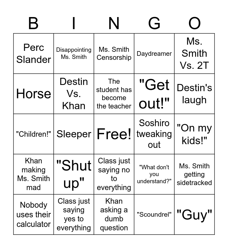 This bingo card has a free space and 29 words: Nobody uses their calculator, Khan getting locked out of class, Sleeper, "If you actually did it", Perc Slander, Ms. Smith Censorship, Destin Vs. Khan, "Shut up", Soshiro tweaking out, Class just saying yes to everything, "On my kids!", "Guy", Khan asking a dumb question, "Scoundrel", Destin's laugh, Ragebait, Class just saying no to everything, Khan making Ms. Smith mad, Ms. Smith Vs. 2T, "Children!", "What don't you understand?", Everyone mad at Khan, "Get out!", Horse, Daydreamer, Disappointing Ms. Smith, Ms. Smith getting sidetracked, The student has become the teacher and The teacher has become the student.