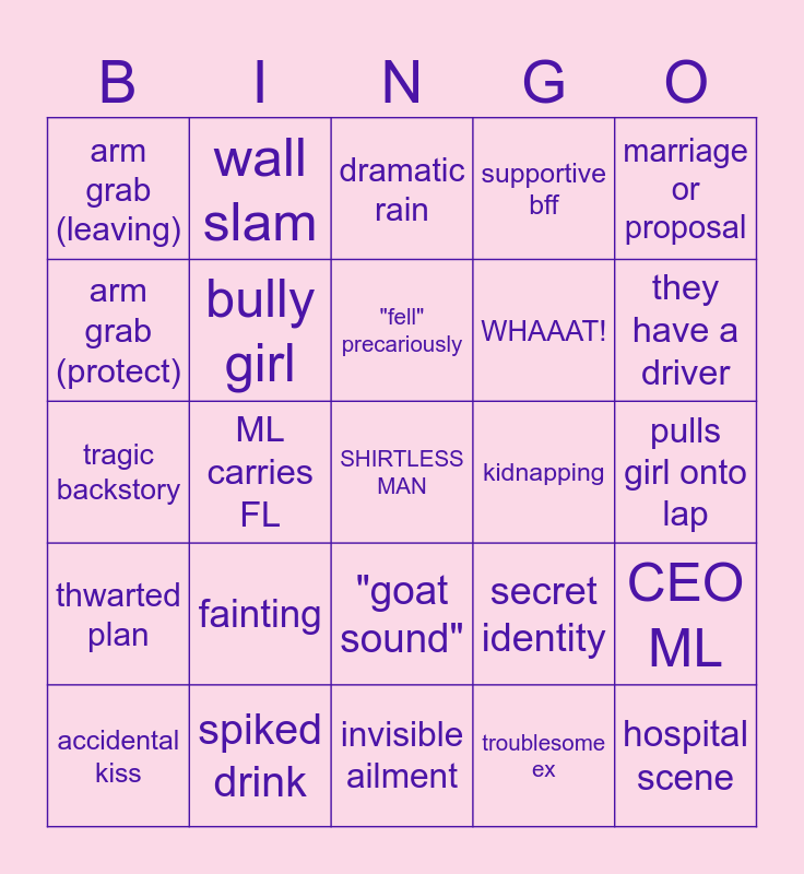 This bingo card has a free space and 24 words: fainting, spiked drink, "fell" precariously, accidental kiss, marriage or proposal, arm grab (leaving), arm grab (protect), wall slam, kidnapping, "goat sound", WHAAAT!, tragic backstory, secret identity, CEO ML, bully girl, troublesome ex, pulls girl onto lap, dramatic rain, they have a driver, ML carries FL, hospital scene, thwarted plan, supportive bff and invisible ailment.