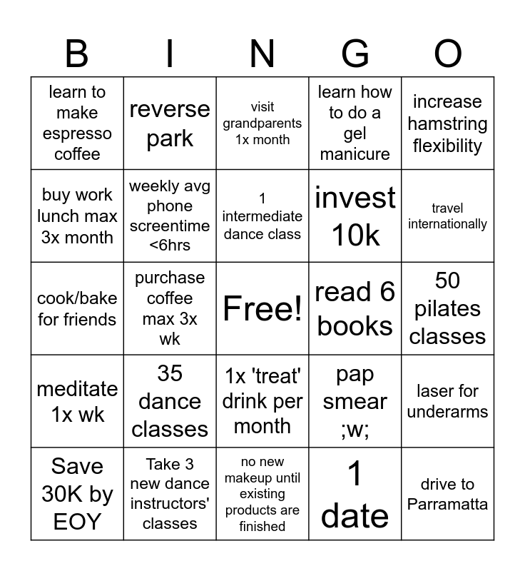 This bingo card has a free space and 24 words: 35 dance classes, Take 3 new dance instructors' classes, 1 intermediate dance class, Save 30K by EOY, increase hamstring flexibility, learn to make espresso coffee, buy work lunch max 3x month, reverse park, read 6 books, 1x 'treat' drink per month, invest 10k, cook/bake for friends, pap smear ;w;, laser for underarms, weekly avg phone screentime <6hrs, 1 date, 50 pilates classes, visit grandparents 1x month, travel internationally, purchase coffee max 3x wk, drive to Parramatta, meditate 1x wk, learn how to do a gel manicure and no new makeup until existing products are finished.