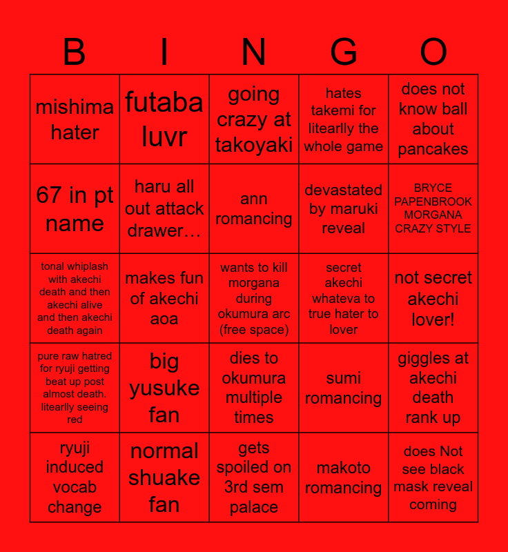 This bingo card has a free space and 24 words: big yusuke fan, normal shuake fan, ann romancing, ryuji induced vocab change, does not know ball about pancakes, mishima hater, 67 in pt name, futaba luvr, secret akechi whateva to true hater to lover, dies to okumura multiple times, devastated by maruki reveal, tonal whiplash with akechi death and then akechi alive and then akechi death again, sumi romancing, giggles at akechi death rank up, haru all out attack drawer…, makoto romancing, not secret akechi lover!, going crazy at takoyaki, BRYCE PAPENBROOK MORGANA CRAZY STYLE, makes fun of akechi aoa, does Not see black mask reveal coming, pure raw hatred for ryuji getting beat up post almost death. litearlly seeing red, hates takemi for litearlly the whole game and gets spoiled on 3rd sem palace.