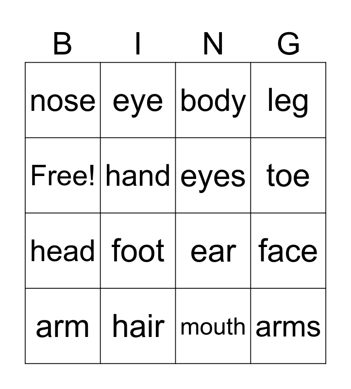 This bingo card has 16 words: hair, face, body, nose, head, eye, ear, mouth, Free!, hand, arm, leg, foot, toe, eyes and arms.