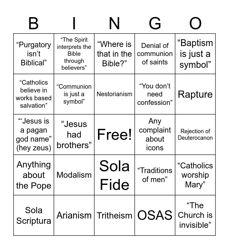 This bingo card has a free space and 24 words: Modalism, Arianism, Nestorianism, Sola Scriptura, “Baptism is just a symbol”, “Purgatory isn’t Biblical”, “Catholics believe in works based salvation”, “The Spirit interprets the Bible through believers”, Any complaint about icons, Sola Fide, “You don’t need confession”, “‘Jesus is a pagan god name” (hey zeus), “Traditions of men”, “Catholics worship Mary”, “Communion is just a symbol”, OSAS, Rejection of Deuterocanon, “Where is that in the Bible?”, Rapture, “Jesus had brothers”, “The Church is invisible”, Anything about the Pope, Denial of communion of saints and Tritheism.