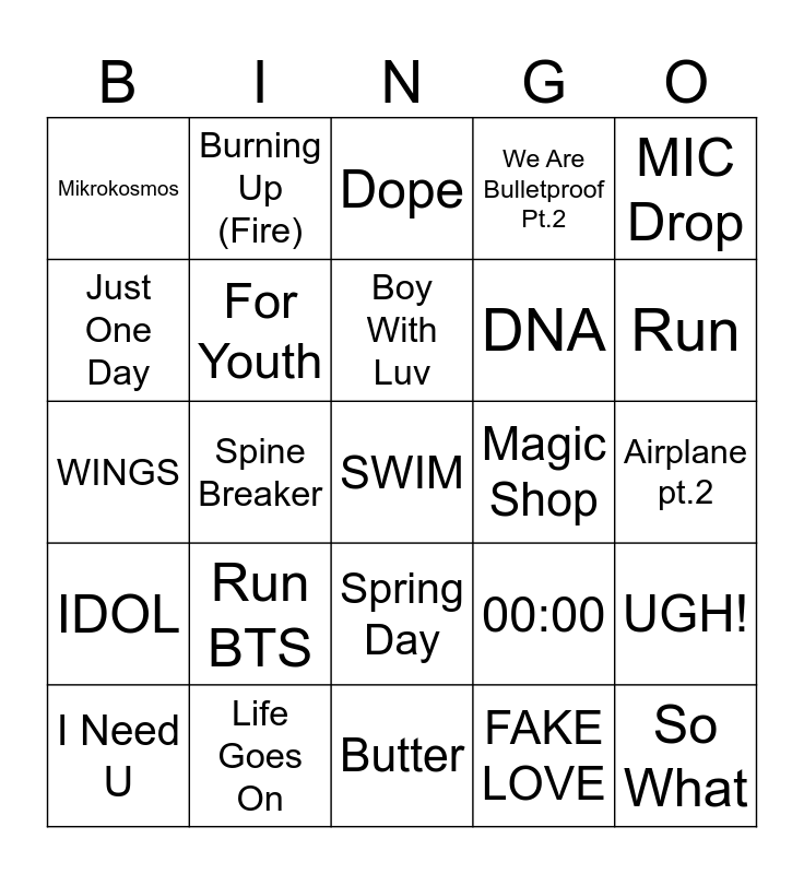 This bingo card has a free space and 24 words: Run BTS, Life Goes On, Boy With Luv, I Need U, MIC Drop, Mikrokosmos, Just One Day, Burning Up (Fire), Magic Shop, Spring Day, DNA, WINGS, 00:00, UGH!, For Youth, FAKE LOVE, Airplane pt.2, Dope, Run, Spine Breaker, So What, IDOL, We Are Bulletproof Pt.2 and Butter.