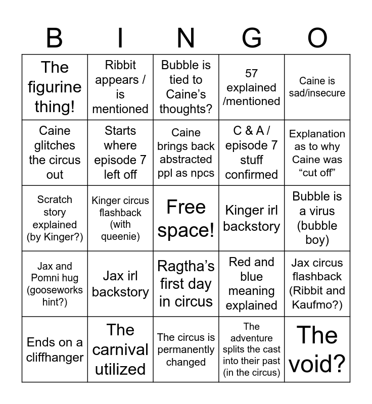 This bingo card has a free space and 24 words: Jax irl backstory, The carnival utilized, Caine brings back abstracted ppl as npcs, Ends on a cliffhanger, Caine is sad/insecure, The figurine thing!, Caine glitches the circus out, Ribbit appears / is mentioned, Kinger irl backstory, Ragtha’s first day in circus, C & A / episode 7 stuff confirmed, Scratch story explained (by Kinger?), Red and blue meaning explained, Jax circus flashback (Ribbit and Kaufmo?), Starts where episode 7 left off, The adventure splits the cast into their past (in the circus), Bubble is a virus (bubble boy), Bubble is tied to Caine’s thoughts?, Explanation as to why Caine was “cut off”, Kinger circus flashback (with queenie), The void?, Jax and Pomni hug (gooseworks hint?), 57 explained /mentioned and The circus is permanently changed.