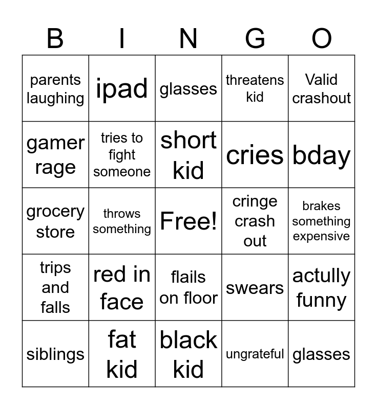 This bingo card has a free space and 24 words: red in face, fat kid, short kid, siblings, Valid crashout, parents laughing, gamer rage, ipad, cringe crash out, flails on floor, cries, grocery store, swears, actully funny, tries to fight someone, ungrateful, brakes something expensive, glasses, bday, throws something, glasses, trips and falls, threatens kid and black kid.