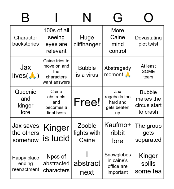 This bingo card has a free space and 24 words: Kinger is lucid, Npcs of abstracted characters, Bubble is a virus, Happy place ending reenactment, Devastating plot twist, Character backstories, Jax lives(🙏), 100s of all seeing eyes are relevant, Jax ragebaits too hard and gets beaten up, Zooble fights with Caine, Abstragedy moment 🙏, Queenie and kinger lore, Kaufmo+ ribbit lore, The group gets separated, Caine tries to move on and the characters want answers, Snowglobes in caine's office are important, Bubble makes the circus start to crash, Huge cliffhanger, At least SOME tears, Caine abstracts and becomes a final boss, Kinger spills some tea, Jax saves the others somehow, More Caine mind control and I abstract next.
