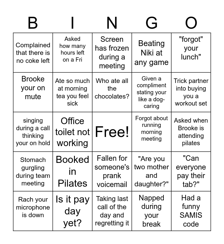 This bingo card has a free space and 24 words: Booked in Pilates, Is it pay day yet?, Who ate all the chocolates?, Rach your microphone is down, "forgot" your lunch", Complained that there is no coke left, Brooke your on mute, Asked how many hours left on a Fri, Forgot about running morning meeting, Fallen for someone's prank voicemail, Given a compliment stating your like a dog- caring, singing during a call thinking your on hold, "Are you two mother and daughter?", "Can everyone pay their tab?", Ate so much at morning tea you feel sick, Napped during your break, Asked when Brooke is attending pilates, Screen has frozen during a meeting, Trick partner into buying you a workout set, Office toilet not working, Had a funny SAMIS code, Stomach gurgling during team meeting, Beating Niki at any game and Taking last call of the day and regretting it.