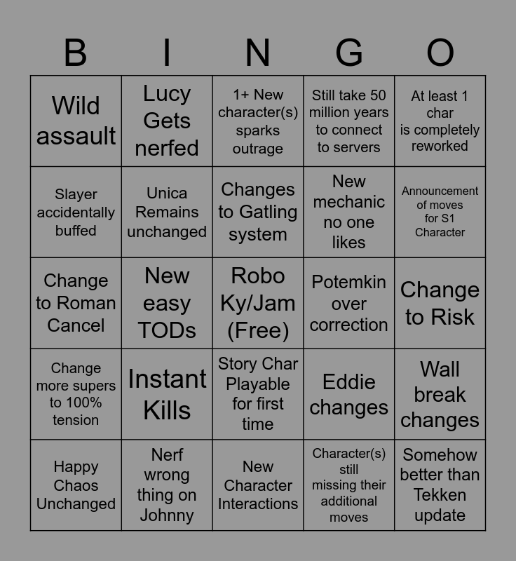This bingo card has a free space and 24 words: Happy Chaos Unchanged, Instant Kills, Changes to Gatling system, Character(s) still missing their additional moves, At least 1 char is completely reworked, Wild assault, Lucy Gets nerfed, 1+ New character(s) sparks outrage, Potemkin over correction, Change to Risk, Change to Roman Cancel, Unica Remains unchanged, Eddie changes, Wall break changes, Slayer accidentally buffed, Nerf wrong thing on Johnny, New Character Interactions, Still take 50 million years to connect to servers, Announcement of moves for S1 Character, Change more supers to 100% tension, New easy TODs, Story Char Playable for first time, New mechanic no one likes and Somehow better than Tekken update.