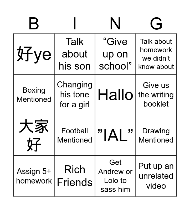 This bingo card has 20 words: Drawing Mentioned, Talk about his Wife, “Give up on school”, Talk about Elon, Assign 5+ homework, Boxing Mentioned, Rich Friends, 好ye, 大家好, Talk about his son, Football Mentioned, ”IAL”, Changing his tone for a girl, Put up an unrelated video, Hallo, Reading Mentioned, Give us the writing booklet, Talk about homework we didn’t know about, Get Andrew or Lolo to sass him and monologue.