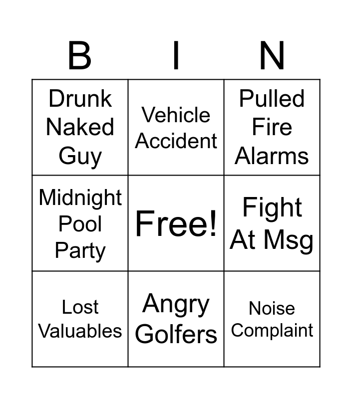 This bingo card has a free space and 8 words: Fight At Msg, Pulled Fire Alarms, Vehicle Accident, Lost Valuables, Drunk Naked Guy, Noise Complaint, Midnight Pool Party and Angry Golfers.