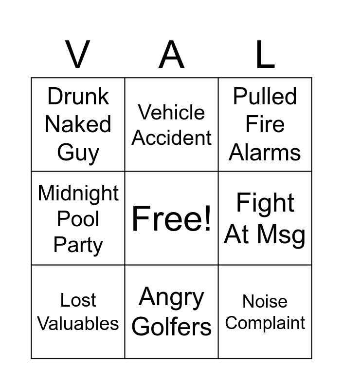 This bingo card has a free space and 8 words: Fight At Msg, Pulled Fire Alarms, Vehicle Accident, Lost Valuables, Drunk Naked Guy, Noise Complaint, Midnight Pool Party and Angry Golfers.