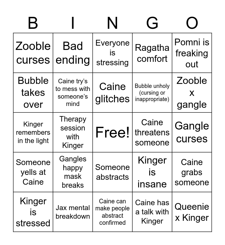 This bingo card has a free space and 24 words: Gangles happy mask breaks, Jax mental breakdown, Caine glitches, Kinger is stressed, Pomni is freaking out, Zooble curses, Bubble takes over, Bad ending, Caine threatens someone, Someone abstracts, Bubble unholy (cursing or inappropriate), Kinger remembers in the light, Kinger is insane, Caine grabs someone, Caine try’s to mess with someone’s mind, Caine has a talk with Kinger, Gangle curses, Everyone is stressing, Zooble x gangle, Therapy session with Kinger, Queenie x Kinger, Someone yells at Caine, Ragatha comfort and Caine can make people abstract confirmed.