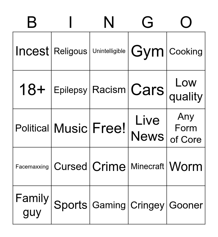 This bingo card has a free space and 24 words: Cursed, Sports, Racism, Family guy, Cooking, Incest, 18+, Religous, Live News, Crime, Cars, Political, Minecraft, Worm, Epilepsy, Cringey, Any Form of Core, Unintelligible, Low quality, Music, Gooner, Facemaxxing, Gym and Gaming.