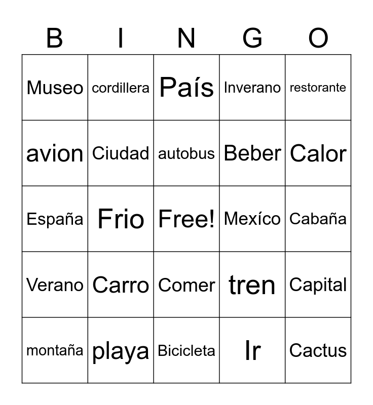 This bingo card has a free space and 24 words: Carro, playa, autobus, montaña, restorante, Museo, avion, cordillera, Mexíco, Comer, Beber, España, tren, Capital, Ciudad, Ir, Cabaña, País, Calor, Frio, Cactus, Verano, Inverano and Bicicleta.