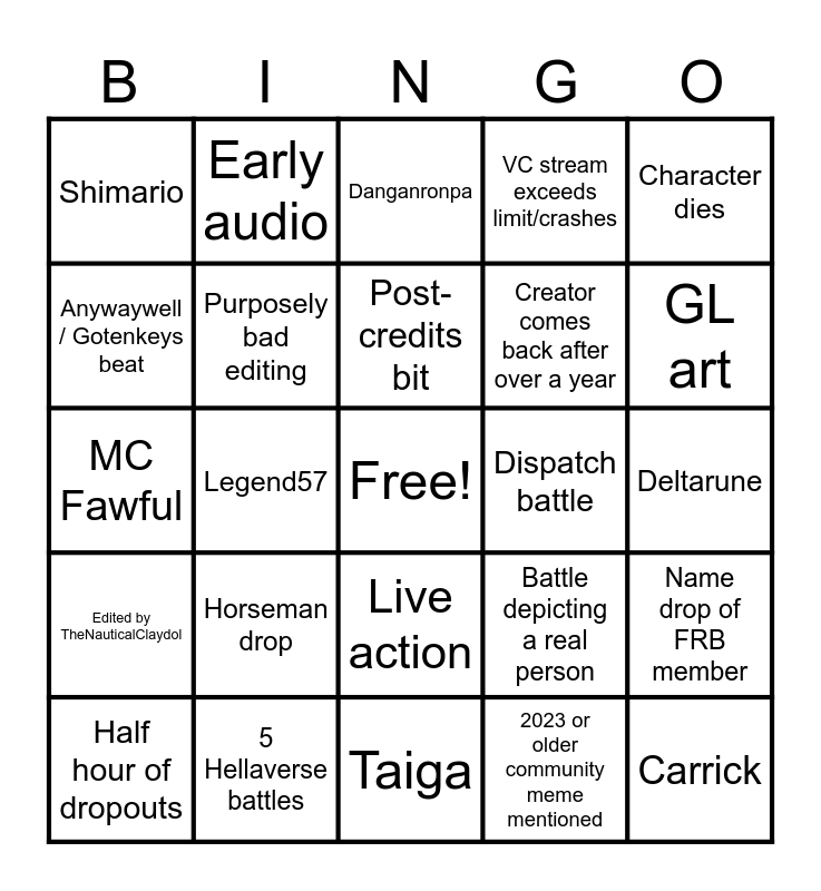 This bingo card has a free space and 24 words: Horseman drop, 5 Hellaverse battles, Post-credits bit, Half hour of dropouts, Character dies, Shimario, Anywaywell / Gotenkeys beat, Early audio, Dispatch battle, Live action, Creator comes back after over a year, MC Fawful, Battle depicting a real person, Name drop of FRB member, Purposely bad editing, 2023 or older community meme mentioned, Deltarune, Danganronpa, GL art, Legend57, Carrick, Edited by TheNauticalClaydol, VC stream exceeds limit/crashes and Taiga.