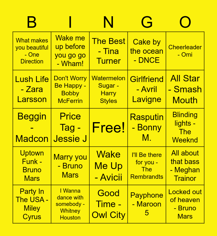 This bingo card has a free space and 48 words: Can't stop this feeling - Justin Timberlake, Locked out of heaven - Bruno Mars, Happy - Pharrell Williams, Good Time - Owl City, Marry you - Bruno Mars, Hey, Soul Sister - Train, Wake me up before you go go - Wham!, APT. - ROSE, Lush Life - Zara Larsson, Hey Ya! - Outkast, Don't Worry Be Happy - Bobby McFerrin, Cake by the ocean - DNCE, All about that bass - Meghan Trainor, I'll Be there for you - The Rembrandts, I'm Yours - Jason Mraz, Flowers - Miley Cyrus, Watermelon Sugar - Harry Styles, Rasputin - Bonny M., Dance Monkey - Tones and I, Cheerleader - Omi, Price Tag - Jessie J, Payphone - Maroon 5, What makes you beautiful - One Direction, Girlfriend - Avril Lavigne, Rather Be - Clean Bandit, All Star - Smash Mouth, Party In The USA - Miley Cyrus, Don't worry be happy - John Martin, Wake Me Up - Avicii, Uptown Funk - Bruno Mars, Shut up and dance - Walk the Moon, Call Me Maybe - Carly Rae Jepsen, Where is my husband - RAYE, Shake it off - Taylor Swift, I Wanna dance with somebody - Whitney Houston, Dancing in the moonlight - Toploader, Don't stop me now - Queen, Blinding lights - The Weeknd, I was made for loving you - KISS, Viva la Vida - Coldplay, Dancing Queen - ABBA, What A Feeling - Irene Cara, The Best - Tina Turner, Mamma Mia - ABBA, Beggin - Madcon, Love Generation - Bob Sinclar, You're the one that i want - John Travolta and YMCA - Village People.