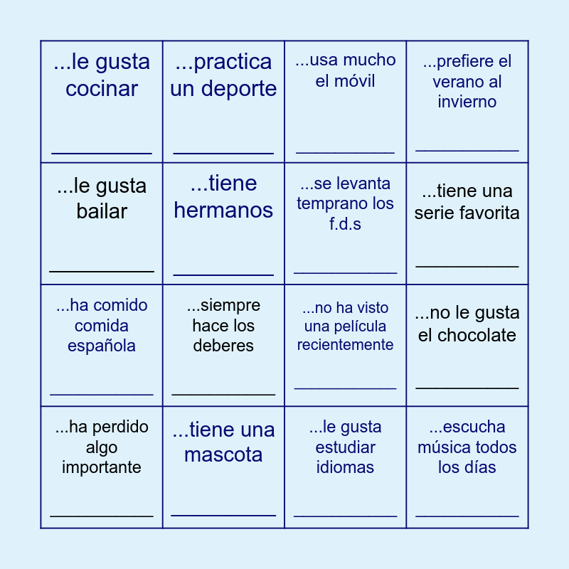 This bingo card has 22 words: ...tiene una mascota _________, ...ha viajado a otro país _________, ...practica un deporte ________, ...le gusta ver series ________, ...tiene hermanos ________, ...se levanta temprano los f.d.s ___________, ...le gusta cocinar ________, ...usa mucho el móvil __________, ...no ha visto una película recientemente ____________, ...escucha música todos los días ___________, ...ha comido comida española ___________, ...prefiere el verano al invierno ___________, ...va a viajar este año __________, ...tiene un hobby interesante ___________, ...le gusta estudiar idiomas ___________, ...puede hablar tres idiomas ___________, ...no le gusta el chocolate __________, ...ha perdido algo importante ___________, ...siempre hace los deberes ___________, ...le gusta bailar _________, ...tiene una serie favorita __________ and ...ha probado una comida nueva ___________.