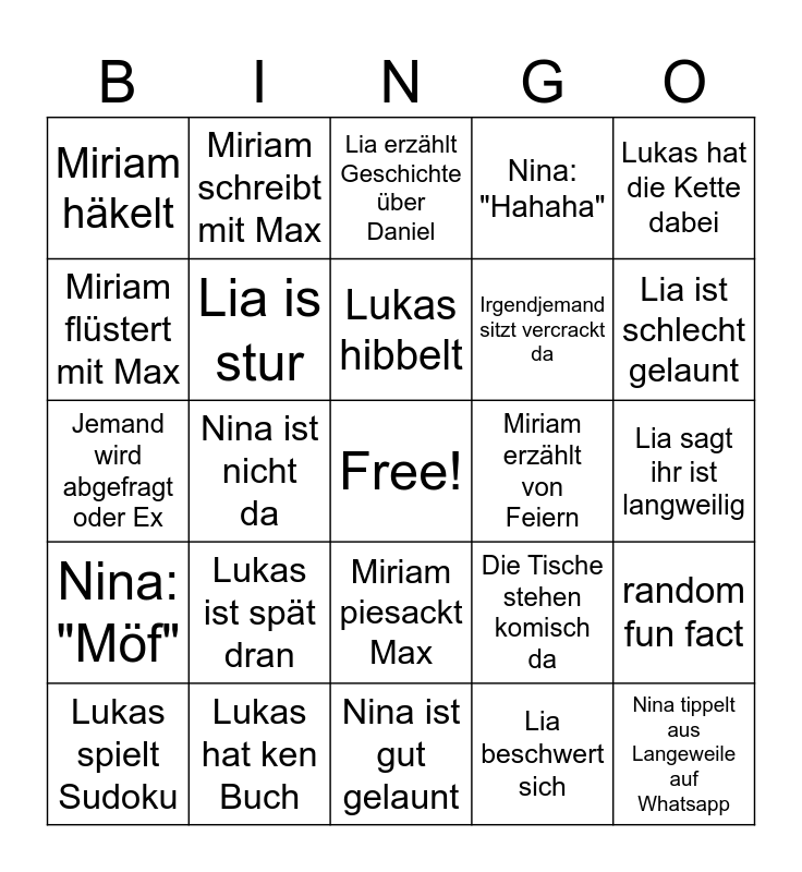 This bingo card has a free space and 24 words: Lukas ist spät dran, Lukas hat ken Buch, Lukas hibbelt, Lukas spielt Sudoku, Lukas hat die Kette dabei, Miriam häkelt, Miriam flüstert mit Max, Miriam schreibt mit Max, Miriam erzählt von Feiern, Miriam piesackt Max, Irgendjemand sitzt vercrackt da, Jemand wird abgefragt oder Ex, Die Tische stehen komisch da, random fun fact, Lia is stur, Lia beschwert sich, Lia sagt ihr ist langweilig, Lia erzählt Geschichte über Daniel, Lia ist schlecht gelaunt, Nina ist nicht da, Nina tippelt aus Langeweile auf Whatsapp, Nina: "Möf", Nina: "Hahaha" and Nina ist gut gelaunt.
