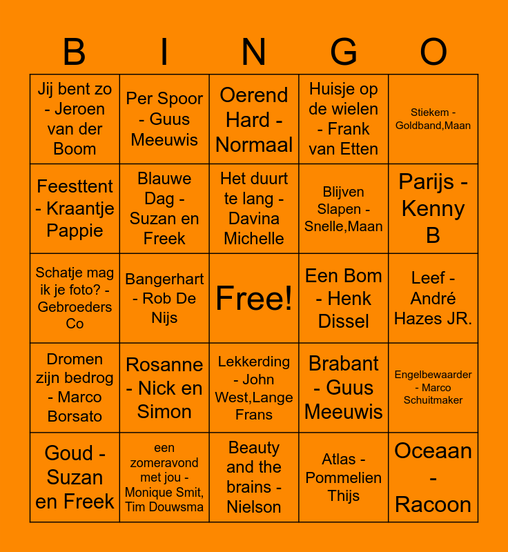 This bingo card has a free space and 48 words: Het Regent Zonnestralen - Acda & De Munnik, Oceaan - Racoon, Zoutelande - BLØF, Beauty and the brains - Nielson, Rosanne - Nick en Simon, Als de morgen is gekomen - Jan Smit, Per Spoor - Guus Meeuwis, Dromendans - Vinzzent, Feesttent - Kraantje Pappie, Louise - Gers Pardoel, Blauwe Dag - Suzan en Freek, Huisje op de wielen - Frank van Etten, Engelbewaarder - Marco Schuitmaker, Brabant - Guus Meeuwis, Kali - django Wagner, Maak me gek - Gerard Joling, Het duurt te lang - Davina Michelle, Een Bom - Henk Dissel, In Spanje - Mart Hoogkamer, Stiekem - Goldband,Maan, Bangerhart - Rob De Nijs, Atlas - Pommelien Thijs, Jij bent zo - Jeroen van der Boom, Blijven Slapen - Snelle,Maan, Smoorverliefd - Snelle, Parijs - Kenny B, Goud - Suzan en Freek, Hoe - Nielson, Lekkerding - John West,Lange Frans, Dromen zijn bedrog - Marco Borsato, Ademnood - Linda, Roos & Jessica, Onderweg - Abel, Toppertje - Guillermo, Ga dan! - Roxy Dekker, een zomeravond met jou - Monique Smit, Tim Douwsma, Mooie Dag - Jayh, Ik ga zwemmen - Mart Hoogkamer, Leef - André Hazes JR., Treur Niet - Diggy Dex, Annabel - Hans de Booij, Vrienden voor het leven - Jan Smit, Links Rechts - Snollebollekes, Oerend Hard - Normaal, Wiegenlied - 3Js, Schatje mag ik je foto? - Gebroeders Co, Dansplaat - Brainpower, Oya Lele - K3 and Rood - Marco Borsato.