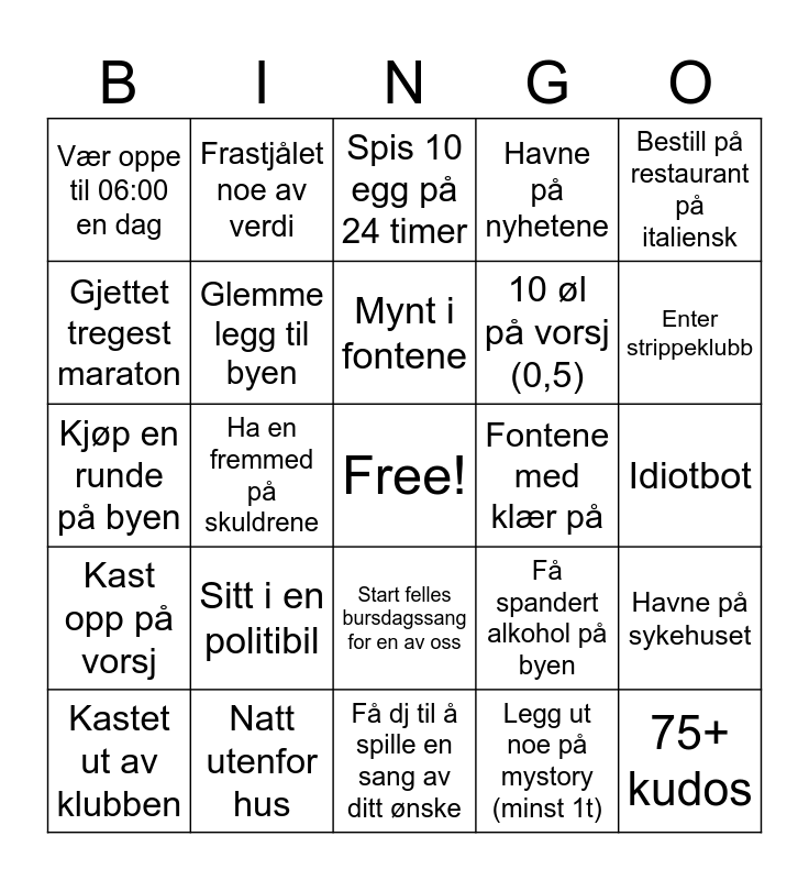 This bingo card has a free space and 24 words: Sitt i en politibil, Natt utenfor hus, Mynt i fontene, Kastet ut av klubben, Bestill på restaurant på italiensk, Vær oppe til 06:00 en dag, Gjettet tregest maraton, Frastjålet noe av verdi, Fontene med klær på, Start felles bursdagssang for en av oss, 10 øl på vorsj (0,5), Kjøp en runde på byen, Få spandert alkohol på byen, Havne på sykehuset, Glemme legg til byen, Legg ut noe på mystory (minst 1t), Idiotbot, Spis 10 egg på 24 timer, Enter strippeklubb, Ha en fremmed på skuldrene, 75+ kudos, Kast opp på vorsj, Havne på nyhetene and Få dj til å spille en sang av ditt ønske.