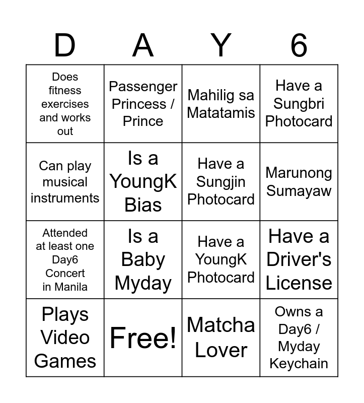 This bingo card has 28 words: Has a denimalz / dupemalz right now, Owns a Sungjin / Young K Solo Album, Attended at least one Day6 Concert in Manila, Is a Sungjin Bias, Is a YoungK Bias, Mahilig sa Matatamis, Passenger Princess / Prince, Owns a Day6 / Myday Keychain, Free!, Attended at least one Day6 Cupsleeve Event, Have a YoungK Photocard, Have a Sungbri Photocard, Natry na ang Dubai Chewy Choco, Nakaka tatlong rice sa Mang Inasal, Is a Baby Myday, Workaholic, Mahilig Mag-luto, Have a Sungjin Photocard, Marunong Sumayaw, Attended a Day6 event outside the country, Does fitness exercises and works out, Knows / Learning more than two languages, Plays Video Games, Have a Driver's License, Matcha Lover, Prefers Iced Mocha, Can play musical instruments and Day6 Fanfic Author / Fan Artist.