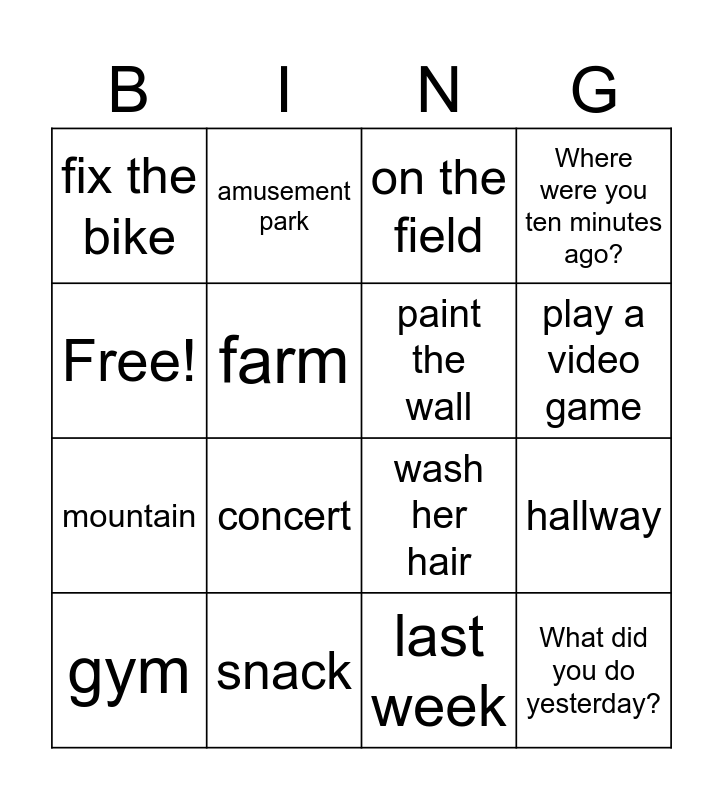 This bingo card has 16 words: snack, hallway, on the field, fix the bike, mountain, amusement park, wash her hair, last week, Free!, farm, gym, Where were you ten minutes ago?, concert, play a video game, paint the wall and What did you do yesterday?.