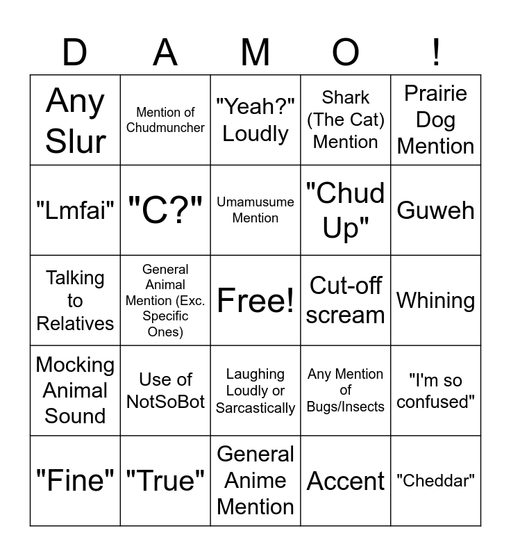 This bingo card has a free space and 24 words: "Fine", Use of NotSoBot, Umamusume Mention, Accent, Prairie Dog Mention, Any Slur, Mention of Chudmuncher, "Yeah?" Loudly, Cut-off scream, Whining, Talking to Relatives, "C?", Any Mention of Bugs/Insects, "I'm so confused", "Lmfai", "True", General Anime Mention, Shark (The Cat) Mention, Guweh, Mocking Animal Sound, General Animal Mention (Exc. Specific Ones), Laughing Loudly or Sarcastically, "Chud Up" and "Cheddar".