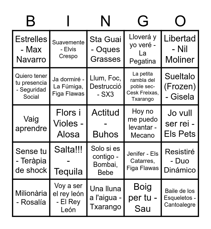 This bingo card has 91 words: Free!, 5 Little Monkeys - The little Sunshine Kids, Solo si es contigo - Bombai, Bebe, Sabor de amor - Danza invisible, Bella Ciao - Fonola Band, Chiquilla - Seguridad Social, Polls - Xiula, No puedo vivir sin ti - Los Ronaldos, Y volar - La Pegatina, Los Caligaris, Alegria - El Diluvi, APT. - Rosé, Bruno Mars, Ay Mamá - Rigoberta Bandini, Bon Dia - Els Pets, Jo vull ser rei - Els Pets, Eram sam sam - Bellaterra Música, Llum, Foc, Destrucció - SX3, 20 de abril - Celtas Cortos, El Monstruo de la Laguna - Latin Show, Himne dels Pirates - Carlos Gramaje, L'Empordà - Sopa De Cabra, Cuando zarpa el amor - Camela, Mi gran noche - Raphael, Una lluna a l'aigua - Txarango, Mil Batalles - Buhos, Vaig aprendre, Voy a ser el rey león - El Rey León, Hakuna Matata - El Rey León, Els teus ulls - Alfred Garcia, El Vals del Obrero - Ska-P, Pop - La oreja de Van Gogh, Flowers - Miley Cyrus, Resistiré - Duo Dinámico, Coti x Coti - The Tyets, Sense tu - Teràpia de shock, Estrelles - Max Navarro, Lloverá y yo veré - La Pegatina, Sta Guai - Oques Grasses, Olívia - The Tyets, Flors i Violes - Alosa, Sueltalo (Frozen) - Gisela, Milionària - Rosalía, Quiero tener tu presencia - Seguridad Social, You're the one that I want - Grease, La platja - Stay Homas, The Tyets, Pisando flores - Ara Malikian, Jenifer - Els Catarres, Figa Flawas, Que tinguem sort - Lluis Llach, Garotes a Premià de Mar - El Pony Pisador, Volcans - Buhos, La Marina sta morena - Figa Flawas, In the Night - Oques Grasses, La petita rambla del poble sec- Cesk Freixas, Txarango, Sóc un Mico - El pot petit, Les nits no moren mai - Doctor Prats, Tobogan - ZOO, La Perla - Rosalía, Hoy no me puedo levantar - Mecano, Transmets Energia - Buhos, Sort de tu - Oques Grasses, Cançó dels Premianencs - Ferran Martínez, Nexo 04. Tu cuerpo en braille - Nil Moliner, Nochentera - Vicco, No és Miami - Buhos, Els Catarres, Henry Mendez, Només viure - Ginestà, Corren - Gossos, Ella - Bebe, Flying Free - Pont Aeri, Boig per tu - Sau, Aquí no hay playa - The Refrescos, El Lleó vergonyós - El pot petit, Salta!!! - Tequila, Actitud - Buhos, Miedo - M-Clan, Wannabe - Spice Girls, Suavemente - Elvis Crespo, Ja dormiré - La Fúmiga, Figa Flawas, Festa Major - La Trinca, Me colé en una fiesta - Mecano, Eso que tu me das - Jarabe de Palo, Serà perquè t'estimo - Buhos, Baile de los Esqueletos - Cantoalegre, Libertad - Nil Moliner, Mari Carmen - La Pegatina, M'agrada anar de colonies - Jordi Tonietti, Caminem lluny - Doctor Prats, De tot el món, Voy a pasármelo bien - Hombres G, Escriurem - Miki Nuñez, Que no s'acabi - Figa Flawas, Bicicletes - Blaumunt and Llença't - Lax'n'Busto.