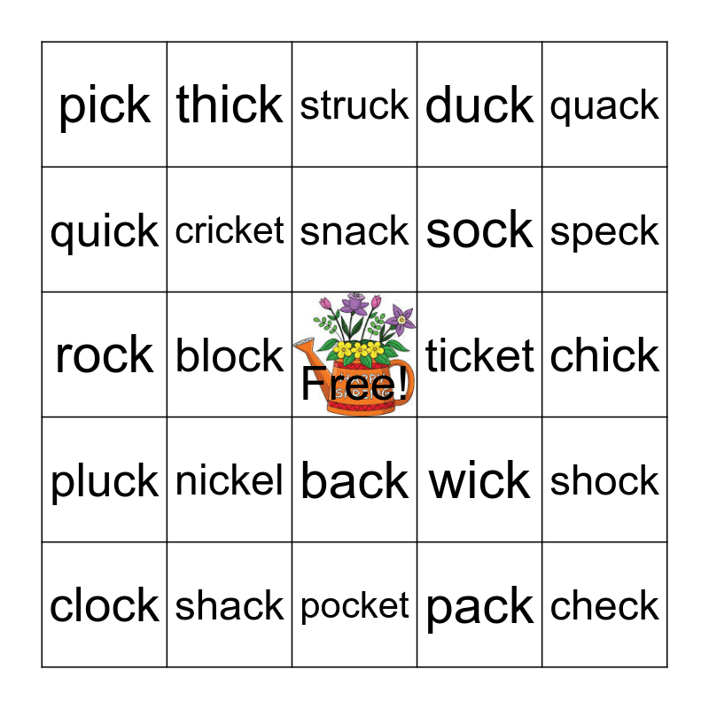 This bingo card has a free space and 26 words: back, pack, snack, shack, quack, pick, quick, thick, chick, wick, sock, rock, shock, clock, block, stuck, duck, pluck, struck, check, speck, pocket, ticket, nickel, cricket and jacket.