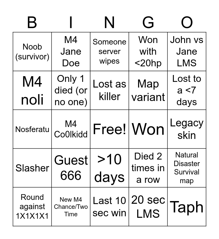 This bingo card has a free space and 24 words: Guest 666, New M4 Chance/Two Time, Lost as killer, Round against 1X1X1X1, John vs Jane LMS, Noob (survivor), M4 noli, M4 Jane Doe, Won, >10 days, Map variant, Nosferatu, Died 2 times in a row, Natural Disaster Survival map, Only 1 died (or no one), 20 sec LMS, Legacy skin, Someone server wipes, Lost to a <7 days, M4 Co0lkidd, Taph, Slasher, Won with <20hp and Last 10 sec win.
