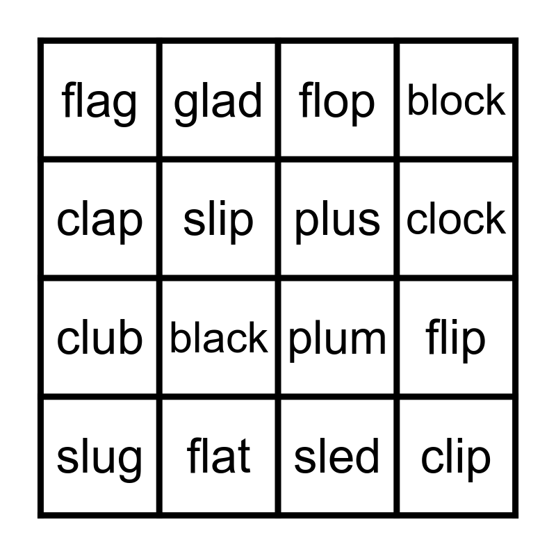This bingo card has 16 words: flat, flip, flop, flag, club, glad, plum, sled, clap, slip, slug, block, black, clock, plus and clip.