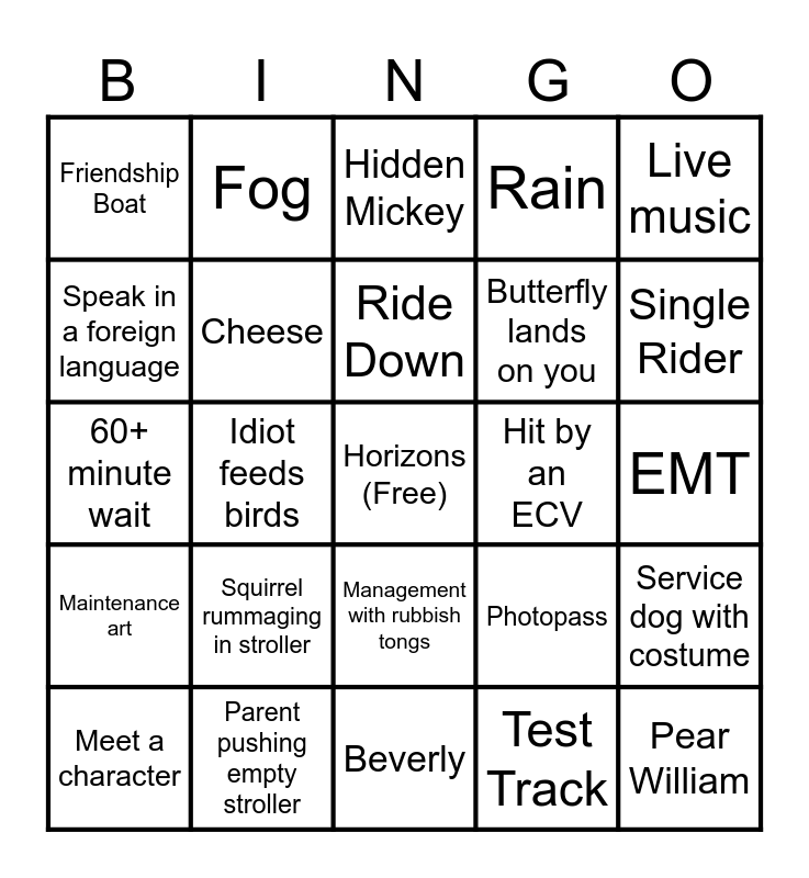 This bingo card has a free space and 29 words: Meet a character, Tequila!, Idiot feeds birds, Cross a bridge, Friendship Boat, Hidden Mickey, Cheese, Squirrel rummaging in stroller, Hit by an ECV, Parent pushing empty stroller, EMT, Pear William, Beverly, Test Track, Single Rider, British family, Management with rubbish tongs, Maintenance art, Live music, 60+ minute wait, Photopass, Catherine O'Hara, Butterfly lands on you, Speak in a foreign language, Rain, Fog, Service dog with costume, Ride Down and Socks with sandals.