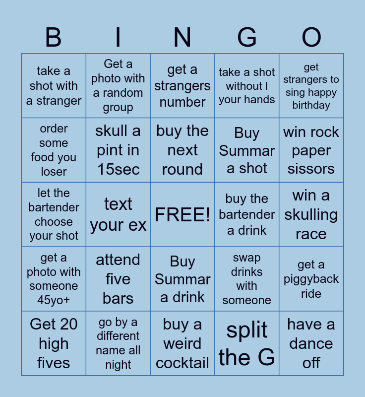 This bingo card has a free space and 34 words: overshare, Take a shot with no hands, rub a bald head, selfie with a stranger’s hat, win a skulling race, order some food you loser, skull a pint in 15sec, buy a weird cocktail, Buy Summar a shot, have a dance off, let the bartender choose your shot, Get a photo with a random group, split the G, get a bag 👀, get a photo with someone 45yo+, text your ex, Buy Summar a drink, buy the bartender a drink, get a piggyback ride, Get 20 high fives, go by a different name all night, get a stranger to buy you a drink, take a shot without l your hands, win rock paper sissors, checked this box off if you puked, attend five bars, get a strangers number, double shot drink, get strangers to sing happy birthday, take a shot with a stranger, call someone and sing to them, buy the next round, swap drinks with someone and get DJ to play your song.