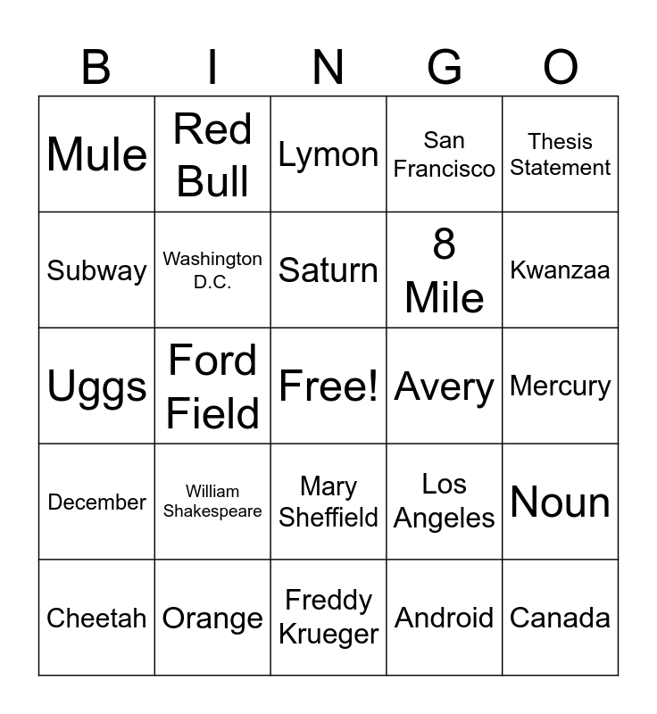 This bingo card has a free space and 84 words: Sutter, Boy Willie, Lymon, Doaker, Berniece, Pittsburgh, Detroit, Lansing, Proverbs, Foreshadowing, Garrett Morgan, Symbolism, Washington D.C., Avery, A Summer Tragedy, Mule, Cheetah, Subway, Arby's, Facebook, Clark Kent, 8 Mile, Canada, Heart, Ford Field, Dave, 8, 48, Chicago, Atlanta, William Shakespeare, Cardi B., Wash Your Hands, Uggs, Sinners, Chucky, Freddy Krueger, Lawrence Tech University, Kwanzaa, December, McDonald's, New York, Coffee, Starbuck's, Wayne State University, Michigan State University, Red Bull, 9, Thanksgiving, Black Panther, Ohio, Los Angeles, San Francisco, X, Covid -19, Banana, Orange, Saturn, Jupiter, Mercury, Iron-Man, Sacramento, Mexico, February, Red Wings, The Hulk, 2020, Joe Biden, Thesis Statement, Topic Sentence, Noun, Verb, Spongebob Square Pants, Bikini Bottom, Mary Sheffield, Android, Apple, Cedar Point, Algebra, Financial Literacy, 4 Months, Instagram, Geometry and June.
