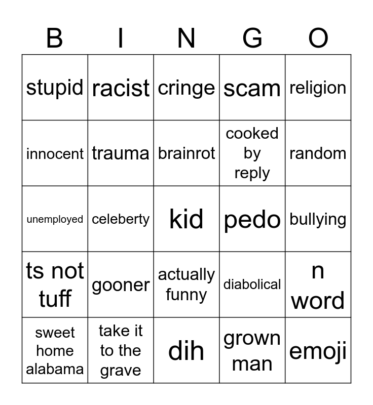 This bingo card has a free space and 24 words: gooner, take it to the grave, brainrot, sweet home alabama, religion, stupid, innocent, racist, pedo, actually funny, cooked by reply, unemployed, diabolical, n word, trauma, grown man, bullying, cringe, random, celeberty, emoji, ts not tuff, scam and dih.