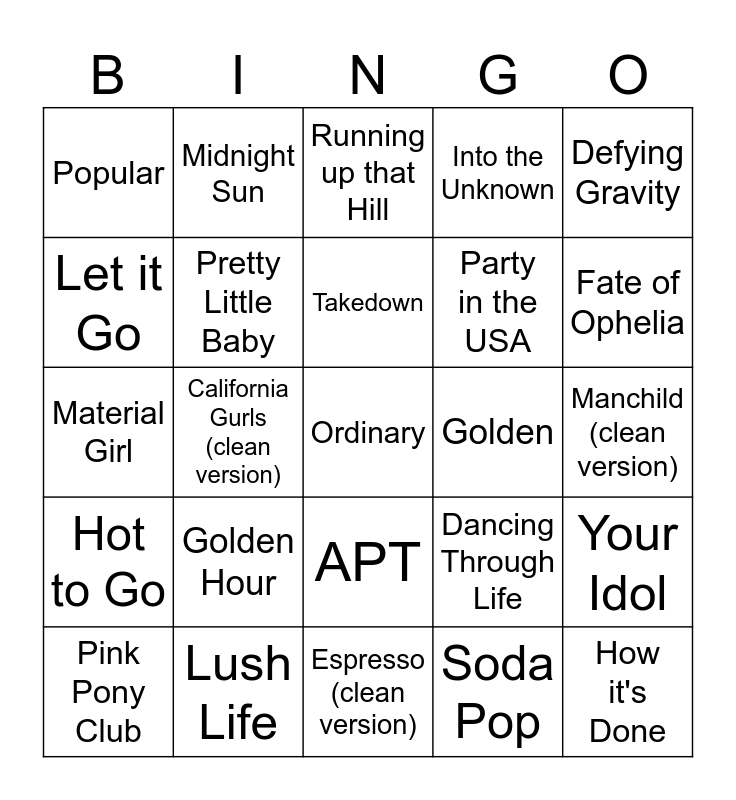 This bingo card has a free space and 24 words: Golden Hour, Lush Life, Takedown, Pink Pony Club, Defying Gravity, Popular, Let it Go, Midnight Sun, Golden, APT, Party in the USA, Material Girl, Dancing Through Life, Your Idol, Pretty Little Baby, Soda Pop, Manchild (clean version), Running up that Hill, Fate of Ophelia, California Gurls (clean version), How it's Done, Hot to Go, Into the Unknown and Espresso (clean version).