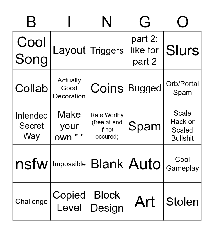 This bingo card has a free space and 24 words: Impossible, Copied Level, Coins, Challenge, Slurs, Cool Song, Collab, Layout, Spam, Blank, Bugged, Intended Secret Way, Auto, Cool Gameplay, Actually Good Decoration, Art, Scale Hack or Scaled Bullshit, Triggers, Orb/Portal Spam, Make your own " ", Stolen, nsfw, part 2: like for part 2 and Block Design.